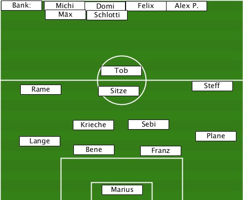--Bank:-------------------------- -------Michi--Domi--Felix-Alex P.--- -------Mäx----Schlotti------------ ---------------Tob--------------- ----Ramé-------Sitze---------Steff- -----------Krieche-Sebi----------- ----Lange-------------------Plane- -----------Bene------Franz-------- ---------------Marius------------