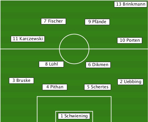 --------------------------13 Brinkmann ----------7 Fischer--9 Pfände----- ----11 Karczewski-----------10 Porten ----------8 Lühl-----6 Dikmen----- ---3 Bruske-----------------2 Uebbing -----------4 Pithan--5 Schertes--- --------------1 Schwiening-------
