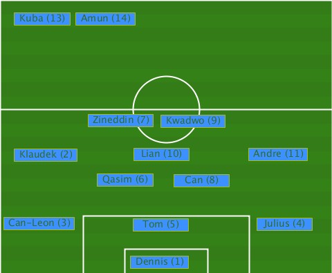 ---------Amun (14)--------------- ---Kuba (13)--------------------- ----------Zineddin (7)-Kwadwo (9)- ---Klaudek (2)-Lian (10)---Andre (11) -----------Qasim (6)-Can (8)------ --Can-Leon (3)-Tom (5)------Julius (4) --------------Dennis (1)---------