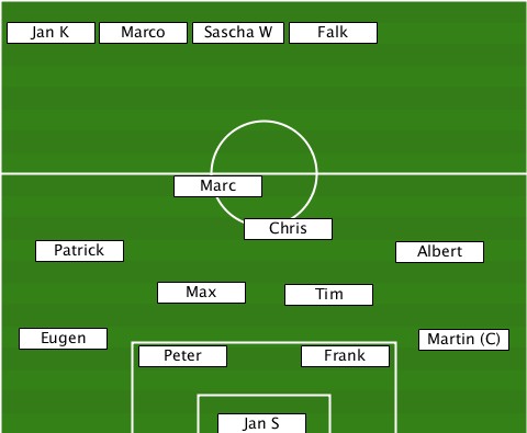 -------------------Falk---------- --Jan K-Marco--Sascha W------------ ------------Marc----------------- ----------------Chris------------ ----Patrick---------------Albert-- -----------Max------Tim----------- ---Eugen--------------------Martin (C) ----------Peter------Frank-------- ---------------Jan S-------------