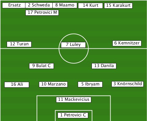 --Ersatz------------------------- -------2 Schweda-8 Maamo-14 Kurt-15 Karakurt -------17 Petrovici M------------ ---12 Turan-----7 Luley-----6 Kemnitzer --------9 Bulat C-----13 Danila--- --16 Ali---10 Marzano-5 Ibryam-3 Knörnschild --------------11 Mackevicius----- --------------1 Petrovici C------