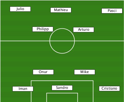 ----Julio------------------------ --------------Mathieu--------Pasci ----------Philipp----Arturo------- ----------Onur--------Mike-------- -----Iman-------Sandro-------Cristiano