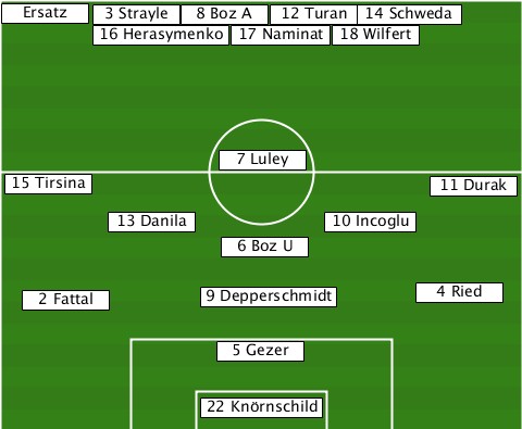 --Ersatz------------------------- -------3 Strayle-8 Boz A-12 Turan-14 Schweda -------16 Herasymenko-17 Naminat-18 Wilfert ---------------7 Luley----------- --15 Tirsina-----------------11 Durak --------13 Danila-----10 Incoglu-- ---------------6 Boz U----------- ---2 Fattal----9 Depperschmidt-4 Ried ---------------5 Gezer----------- --------------22 Knörnschild-----