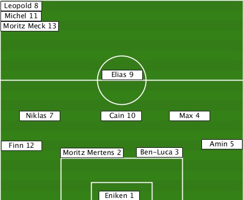 --Leopold 8---------------------- --Michel 11---------------------- --Moritz Meck 13----------------- ---------------Elias 9----------- ----Niklas 7----Cain 10---Max 4---- --Finn 12-Moritz Mertens 2-Ben-Luca 3-Amin 5 --------------Eniken 1-----------
