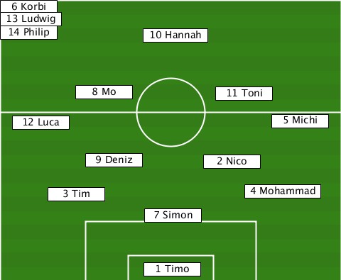 -6 Korbi------------------------- -13 Ludwig----------------------- -14 Philip------10 Hannah--------- ---------8 Mo----------11 Toni---- ---12 Luca------------------5 Michi ---------9 Deniz------2 Nico------ ------3 Tim--------------4 Mohammad ---------------7 Simon----------- ---------------1 Timo------------