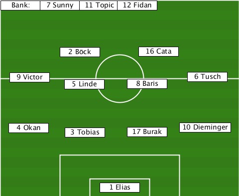 -----------------12 Fidan-------- --Bank:-7 Sunny-11 Topic----------- ---------2 Böck------16 Cata------ ---9 Victor-5 Linde-8 Baris---6 Tusch ---4 Okan--3 Tobias-17 Burak-10 Dieminger ---------------1 Elias-----------