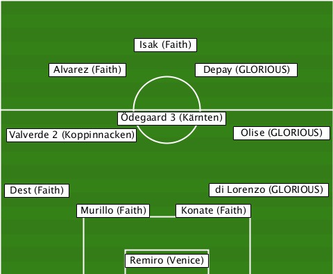 --------------Isak (Faith)------- ------Alvarez (Faith)-Depay (GLORIOUS) -------------Ödegaard 3 (Kärnten) --Valverde 2 (Koppinnacken)-Olise (GLORIOUS) --Dest (Faith)---------di Lorenzo (GLORIOUS) ---------Murillo (Faith)-Konate (Faith) -------------Remiro (Venice)-----
