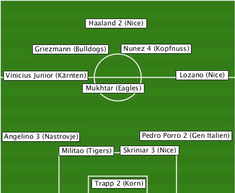 -------------Haaland 2 (Nice)---- ------Griezmann (Bulldogs)-Nunez 4 (Kopfnuss) --Vinicius Junior (Kärnten)-Lozano (Nice) -------------Mukhtar (Eagles)---- --Angelino 3 (Nastrovje)-Pedro Porro 2 (Gen Italien) ---------Militao (Tigers)-Skriniar 3 (Nice) --------------Trapp 2 (Korn)-----