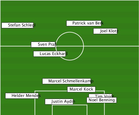 -----------------Patrick van Berk --Stefan Schlegl----------------- -----------------------Joel Klotz ---------Sven Praß--------------- ---------Lucas Eckhard----------- -----------Marcel Schmellenkamp-- -----------------Marcel Kock----- ---Helder Mendes-Justin Aydin-Noel Benning-Tim Voigt