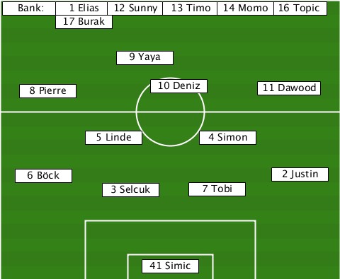 --Bank:-------------------------- -------1 Elias-12 Sunny-13 Timo-14 Momo-16 Topic -------17 Burak------------------ ------------9 Yaya--------------- ---8 Pierre------10 Deniz---11 Dawood ---------5 Linde-----4 Simon------ ---6 Böck-------------------2 Justin -----------3 Selcuk-7 Tobi-------- ---------------41 Simic----------