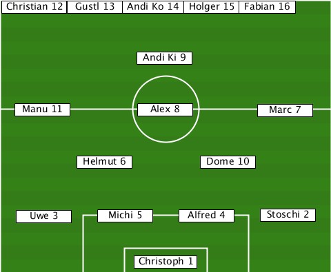 --------Gustl 13----------------- --Christian 12-Andi Ko 14-Holger 15-Fabian 16 ---------------Andi Ki 9--------- ---Manu 11------Alex 8------Marc 7- ---------Helmut 6-----Dome 10----- ---Uwe 3----Michi 5--Alfred 4-Stoschi 2 --------------Christoph 1--------
