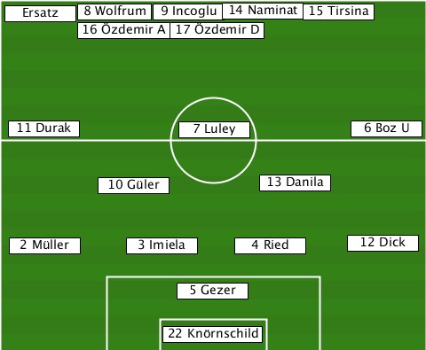 ------------------14 Naminat----- --Ersatz-8 Wolfrum-9 Incoglu-15 Tirsina -------16 Özdemir A-17 Özdemir D-- --11 Durak------7 Luley-------6 Boz U ---------10 Güler-----13 Danila--- --2 Müller--3 Imiela-4 Ried----12 Dick ---------------5 Gezer----------- --------------22 Knörnschild-----
