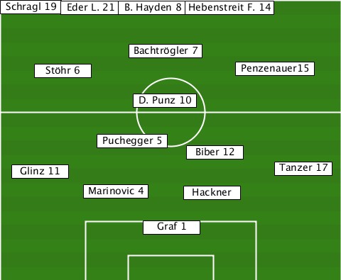 -Schragl 19---------------------- -------Eder L. 21-B. Hayden 8-Hebenstreit F. 14 --------------Bachtrögler 7------ -----Stöhr 6-------------Penzenauer15 --------------D. Punz 10--------- -----------Puchegger 5----------- -------------------Biber 12------ ---Glinz 11-----------------Tanzer 17 ---------Marinovic 4-Hackner------ ---------------Graf 1------------