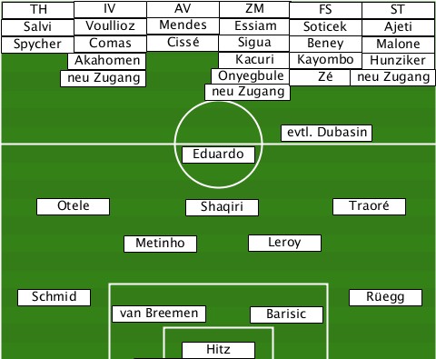 -----------------ZM-------------- --TH----IV----AV----------FS----ST--- --Salvi-Voullioz-Mendes-Essiam-Soticek-Ajeti --Spycher-Comas-Cissé-Sigua-Beney-Malone ------Akahomen----Kacuri-Kayombo-Hunziker ------neu Zugang--Onyegbule-Zé-neu Zugang ----------------neu Zugang------- ----------------------evtl. Dubasin ---------------Eduardo----------- ----Otele-------Shaqiri-----Traore- -----------Metinho---Leroy-------- ---Schmid-------------------Rüegg- ----------van Breemen-Barisic----- ---------------Hitz--------------