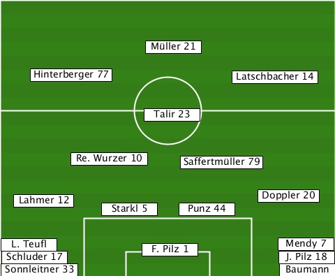 ---------------Müller 21--------- ----Hinterberger 77------Latschbacher 14 ---------------Talir 23---------- --------Re. Wurzer 10-Saffertmüller 79 ---Lahmer 12-Starkl 5-Punz 44-Doppler 20 --L. Teufl-Schluder 17-F. Pilz 1-Mendy 7-J. Pilz 18 --Sonnleitner 33-------------Baumann