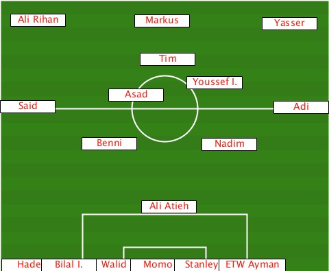 --Ali Rihan---------------------- ---------------Markus-------Yasser ---------------Tim--------------- --------------------Youssef I.--- ------------Asad----------------- -Said------------------------Adi-- ---------Benni--------Nadim------- ---------------Ali Atieh--------- --Hade-Bilal I.-Walid-Momo-Stanley-ETW Ayman