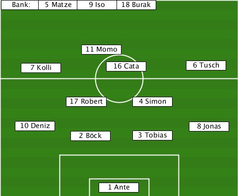 -----------------18 Burak-------- --Bank:-5 Matze-9 Iso-------------- ------------11 Momo-------------- ----7 Kolli------16 Cata----6 Tusch ----------17 Robert-4 Simon------- ---10 Deniz-----------------8 Jonas -----------2 Böck---3 Tobias------ ---------------1 Ante------------