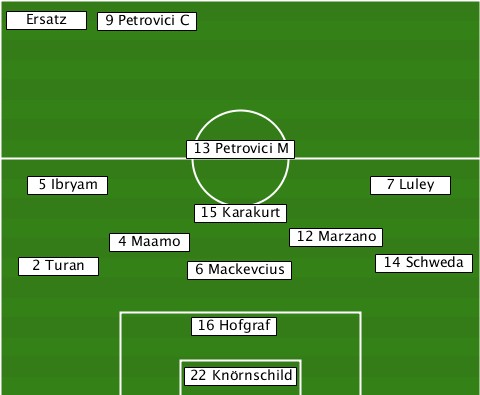 --Ersatz------------------------- --------9 Petrovici C------------ --------------13 Petrovici M----- ---5 Ibryam----------------7 Luley --------------15 Karakurt-------- ---------4 Maamo------12 Marzano-- ---2 Turan-----6 Mackevcius-14 Schweda --------------16 Hofgraf--------- --------------22 Knörnschild-----