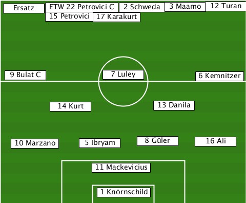----------------------------12 Turan --Ersatz-ETW 22 Petrovici C-2 Schweda-3 Maamo -------15 Petrovici-17 Karakurt--- --9 Bulat C-----7 Luley------6 Kemnitzer --------14 Kurt-------13 Danila--- ---10 Marzano-5 Ibryam-8 Güler-16 Ali -------------11 Mackevicius------ --------------1 Knörnschild------