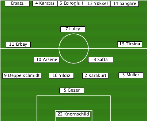 ---------4 Karatas--------------- ---Ersatz------6 Eciroglu I-13 Yüksel-14 Sangare ---------------7 Luley----------- ---11 Erbay-----------------15 Tirsina ---------10 Arsene----8 Safta----- --9 Depperschmidt-16 Yildiz-2 Karakurt-3 Müller --------------5 Gezer------------ --------------22 Knörnschild-----