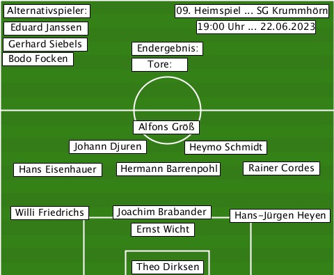 --Alternativspieler:------------- ------------------09. Heimspiel ... SG Krummhörn --Eduard Janssen-----19:00 Uhr ... 22.06.2023 --Gerhard Siebels-Endergebnis:---- --Bodo Focken--Tore:-------------- --------------Alfons Größ-------- --------Johann Djuren-Heymo Schmidt ---Hans Eisenhauer-Hermann Barrenpohl-Rainer Cordes --Willi Friedrichs-Joachim Brabander-Hans-Jürgen Heyen --------------Ernst Wicht-------- --------------Theo Dirksen-------