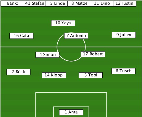 ----------------------11 Dino---- --Bank:-41 Stefan-5 Linde-8 Matze-12 Justin -------------10 Yaya------------- ----16 Cata------7 Antonio---9 Julien ---------4 Simon-----17 Robert---- ---2 Böck---14 Kloppi-3 Tobi--6 Tusch ---------------1 Ante------------