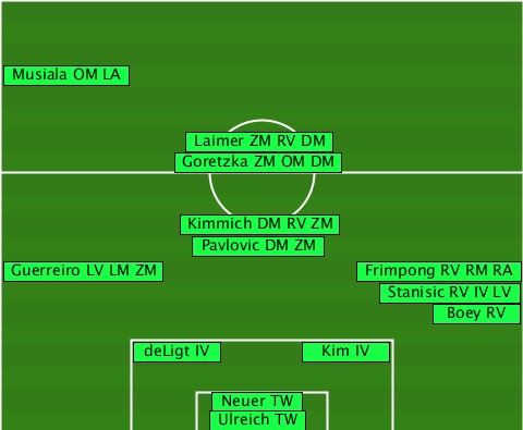 --Musiala OM LA------------------ -------------Laimer ZM RV DM----- ------------Goretzka ZM OM DM---- ------------Kimmich DM RV ZM----- -------------Pavlovic DM ZM------ --Guerreiro LV LM ZM----Frimpong RV RM RA -------------------------Stanisic RV IV LV ----------------------------Boey RV ----------deLigt IV--Kim IV------- --------------Neuer TW----------- --------------Ulreich TW---------