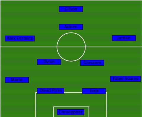 ---------------Gilson------------ ---------------Adrien------------ ---Alex Ferreira------------Jordan ----------Dylan------Giovanni----- ---Mario-------------------Fabio Soares ----------David Pires-Fred-------- --------------Christopher--------