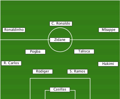 ---------------C. Ronaldo-------- --Ronaldinho-----------------Mbappe ---------------Zidane------------ --------Pogba---------Talisca----- --R. Carlos------------------Hakimi ----------Rüdiger---S. Ramos------ ---------------Casillas----------