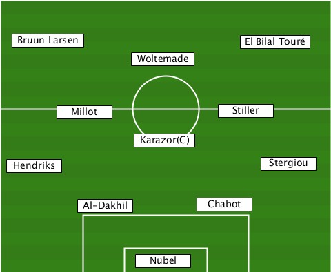 ---Bruun Larsen------------------ -------------------------El Bilal Touré --------------Woltemade---------- -------Millot-----------Stiller--- --------------Karazor(C)--------- --Hendriks------------------Stergiou ---------Al-Dakhil---Chabot------- ---------------Nübel-------------