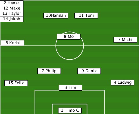 -2 Hanse------------------------- -12 Maxe------------------------- -13 Taylor-14 Jakob-10Hannah-11 Toni --6 Korbi-------8 Mo----------5 Michi ----------7 Philip--9 Deniz------- --15 Felix------------------4 Ludwig ---------------3 Tim------------- ---------------1 Timo C----------