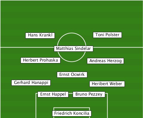 ----------------------Toni Polster -------Hans Krankl--------------- --------------Matthias Sindelar-- ------Herbert Prohaska-Andreas Herzog --------------Ernst Ocwirk------- ----Gerhard Hanappi---Heribert Weber ----------Ernst Happel-Bruno Pezzey -------------Friedrich Koncilia--