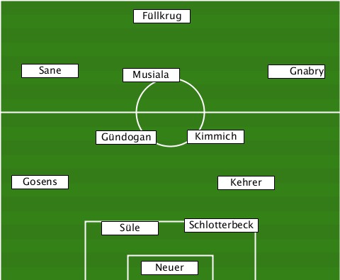 --------------Füllkrug----------- ---Sane-------Musiala--------Gnabry ----------Gündogan--Kimmich------- ---Gosens--------------Kehrer----- -----------Süle-----Schlotterbeck- ---------------Neuer-------------