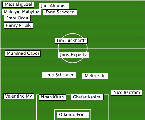 --Mete Eligüzel------------------ ----------Joel Akomea------------ --Maksym Mohylov-Fynn Schween----- --Emre Ördü---------------------- --Henry Pribik------------------- --------------Tim Luckhardt------ ---Muhanad Cabdi-Joris Hupertz---- -----------Leon Schröder-Melih Saki --Valentino My-Noah Kluth-Ghafar Kasimi-Nico Bertram --------------Orlando Ernst------