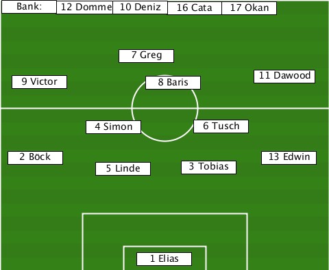 --Bank:-------------------------- -------12 Domme-10 Deniz-16 Cata-17 Okan -------------7 Greg-------------- ---9 Victor------8 Baris----11 Dawood ----------4 Simon----6 Tusch------ --2 Böck----5 Linde--3 Tobias-13 Edwin ---------------1 Elias-----------