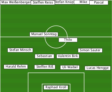 -----------------------Mike------ -Max Weißenberger-Steffen Reiss-Stefan Knüpf-Pascal ----------Manuel Sonntag--------- ------------------Thilo---------- ----Stefan Minsch--------Simon Sauter -----------Sebastian-Valentin Birk ---Harald Rehm-Steffen Riß-Uli Waibel-Lucas Hengge --------------Raphael Kroll------