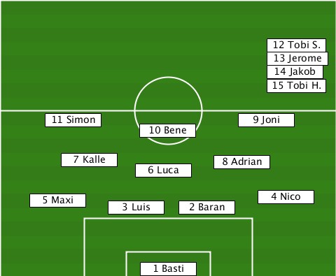 ---------------------------12 Tobi S. ---------------------------13 Jerome ---------------------------14 Jakob ---------------------------15 Tobi H. ------11 Simon-----------9 Joni--- ---------------10 Bene----------- -------7 Kalle-6 Luca---8 Adrian--- ----5 Maxi---3 Luis-2 Baran--4 Nico- ---------------1 Basti-----------