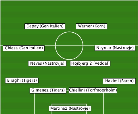 -------------------Werner (Korn)- -------Depay (Gen Italien)------- --Chiesa (Gen Italien)--Neymar (Nastrovje) --------Neves (Nastrovje)-Hojbjerg 2 (Veddel) ---Biraghi (Tigers)-------Hakimi (Bären) --------Gimenez (Tigers)-Chiellini (Torfmoorholm) -------------Martinez (Nastrovje)