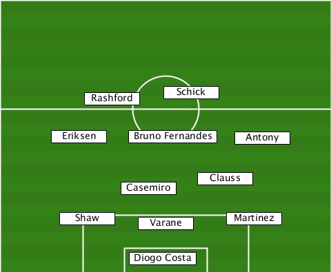 -----------------Schick---------- ----------Rashford--------------- ------Eriksen--Bruno Fernandes-Antony -------------Casemiro-Clauss------ -------Shaw-----Varane---Martinez-- --------------Diogo Costa--------