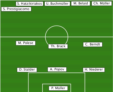 ---------------------------Ch. Müller ------S. Hatzikiriakos-U. Buchmüller-M. Belaid --S. Prestigiacomo--------------- ------M. Polese-Th. Brack--C. Berndt ------D. Stalder-A. Popov--H. Niederer ---------------P. Müller---------