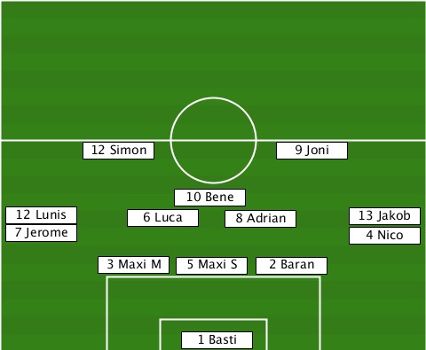 --------12 Simon----------------- ----------------------9 Joni----- ---------------10 Bene----------- --12 Lunis--6 Luca--8 Adrian---13 Jakob --7 Jerome-------------------4 Nico ---------3 Maxi M-5 Maxi S-2 Baran- ---------------1 Basti-----------
