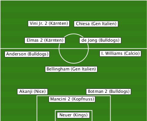 --------Vini Jr. 2 (Kärnten)----- ------------------Chiesa (Gen Italien) -------Elmas 2 (Kärnten)-de Jong (Bulldogs) --Anderson (Bulldogs)---I. Williams (Calcio) -----------Bellingham (Gen Italien) -----Akanji (Nice)---Botman 2 (Bulldogs) ------------Mancini 2 (Kopfnuss)- --------------Neuer (Kings)------