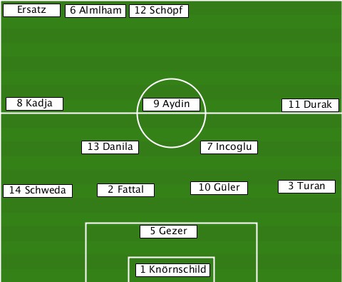 --Ersatz------------------------- --------6 Almlham-12 Schöpf------- --8 Kadja-------9 Aydin-------11 Durak ---------13 Danila---7 Incoglu---- --14 Schweda-2 Fattal-10 Güler-3 Turan ---------------5 Gezer----------- --------------1 Knörnschild------