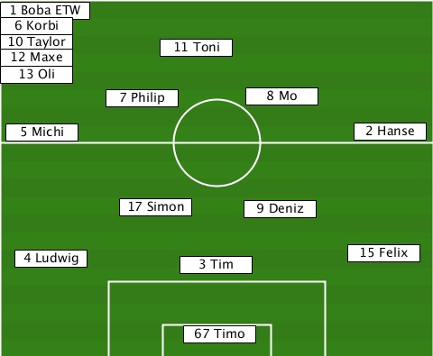 -1 Boba ETW---------------------- -6 Korbi------------------------- -10 Taylor-12 Maxe-11 Toni--------- -13 Oli-------------------------- ---------7 Philip----8 Mo--------- --5 Michi--------------------2 Hanse ----------17 Simon--9 Deniz------- ---4 Ludwig-----3 Tim--------15 Felix ---------------67 Timo-----------
