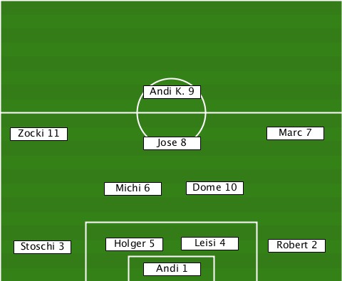 ---------------Andi K. 9--------- --Zocki 11------Jose 8------Marc 7- -----------Michi 6--Dome 10------- ---Stoschi 3-Holger 5-Leisi 4-Robert 2 ---------------Andi 1------------