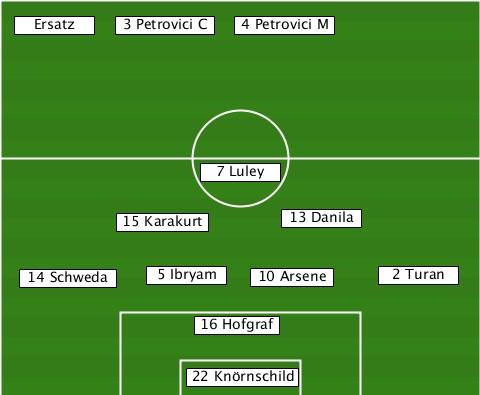 ---------3 Petrovici C----------- --Ersatz----------4 Petrovici M--- ---------------7 Luley----------- ---------15 Karakurt-13 Danila---- ---14 Schweda-5 Ibryam-10 Arsene-2 Turan --------------16 Hofgraf--------- --------------22 Knörnschild-----