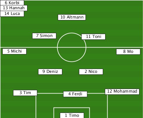 -6 Korbi------------------------- -13 Hannah----------------------- -14 Luca-------10 Altmann--------- ---------7 Simon-----11 Toni------ --5 Michi-------------------8 Mo-- ----------9 Deniz---2 Nico-------- ----3 Tim--------4 Ferdi---12 Mohammad ---------------1 Timo------------