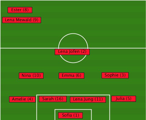 ---Ester (8)--------------------- --Lena Mewald (9)---------------- -------------Lena Jofen (2)------ ------Nina (10)-Emma (6)--Sophie (3) ---Amelie (4)-Sarah (16)-Lena Jung (11)-Julia (5) --------------Sofia (1)----------