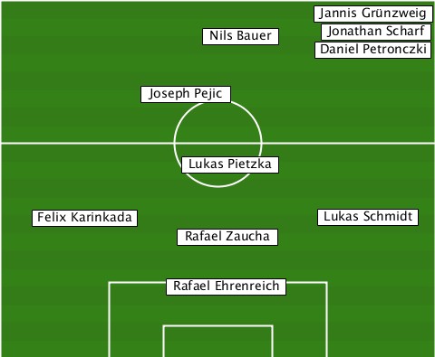 -------------------------Jannis Grünzweig ----------------Nils Bauer-Jonathan Scharf -------------------------Daniel Petronczki ------------Joseph Pejic--------- ---------------Lukas Pietzka----- ----Felix Karinkada-------Lukas Schmidt --------------Rafael Zaucha------ --------------Rafael Ehrenreich--