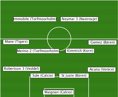 ------------------Neymar 3 (Nastrovje) -----Immobile (Torfmoorholm)----- --Mane (Tigers)-----------Gomez (Bären) ------Merino 2 (Torfmoorholm)-Kimmich (Korn) --Robertson 3 (Veddel)----Acuna (Venice) ----------Süle (Calcio)-St Juste (Bären) -------------Maignan (Calcio)----